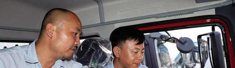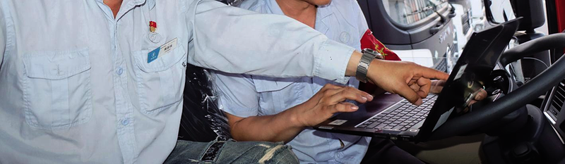 蒋国强(左)指导调试电工对车辆整车控制版本信息及OBD信息参数进行检测