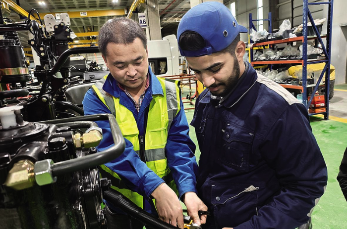韩涛(左)在伊拉克工厂指导当地员工底盘装配