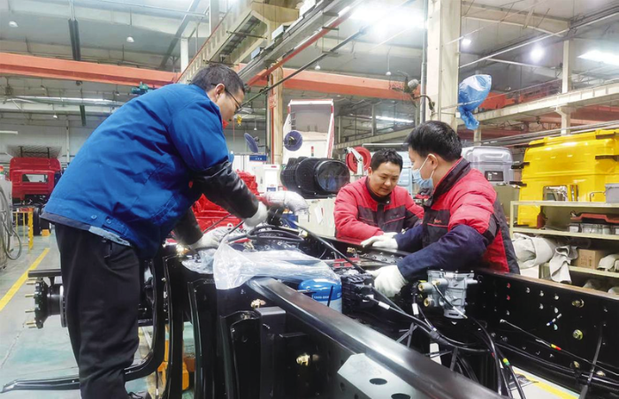 陕汽工匠任敏超(中)带领突击队装配龙骁L2+牵引车